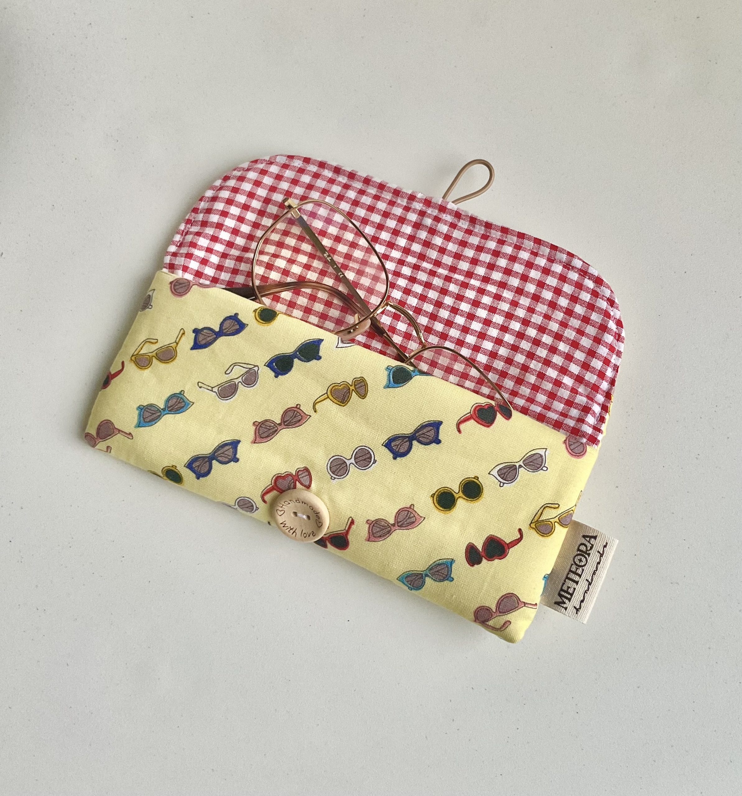 Funda para gafas Gafotas : acolchadita, forrada en vichy rojo y con cierre de goma que se engancha en un botón. Confeccionada en algodón estampado con certificado Oekotex, para que lleves tus gafas siempre a buen recaudo. Listas para llevar, bien protegidas en el bolso, a donde quieras, o en el coche, o incluso para tenerlas guardaditas en casa dentro de una funda así de cuqui.
