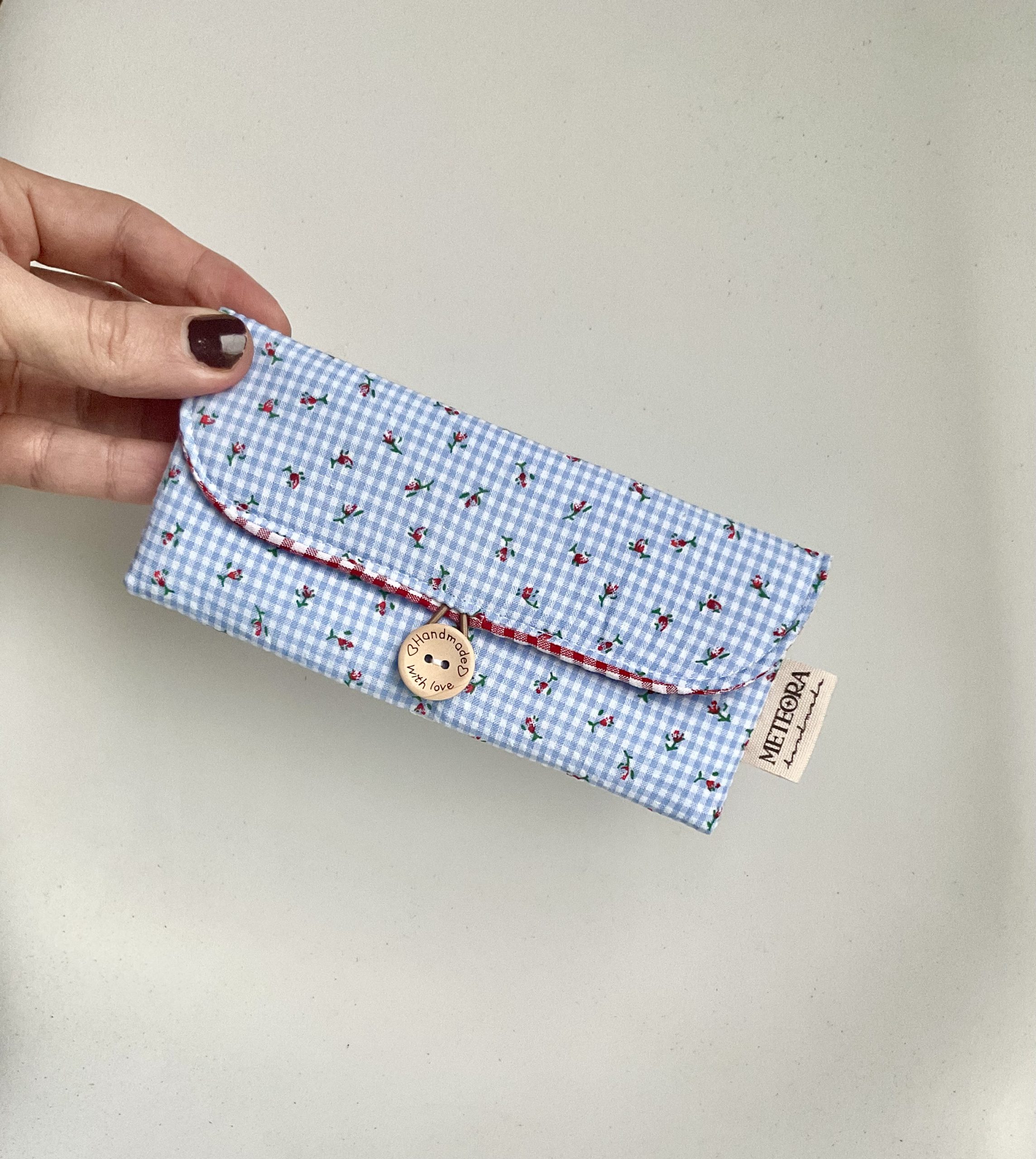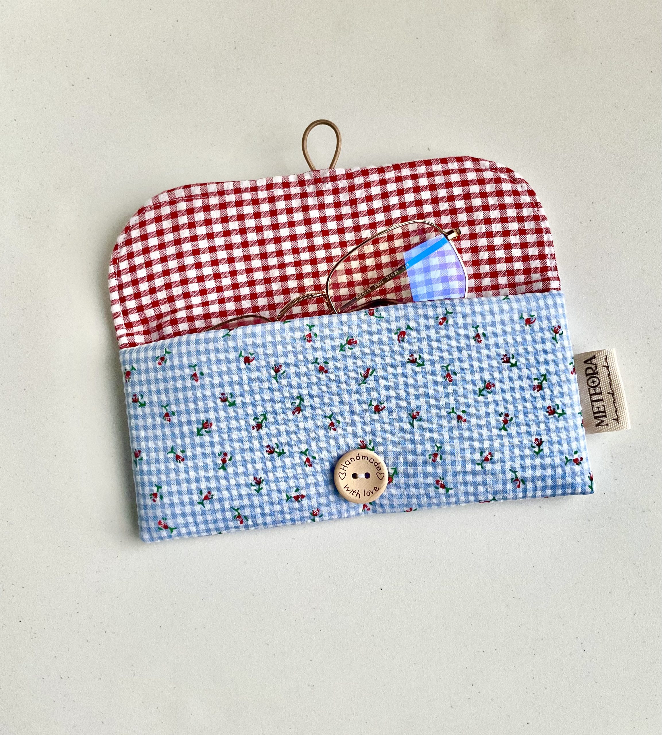 Funda para gafas Rosiña : acolchadita, forrada en vichy rojo y con cierre de goma que se engancha en un botón. Confeccionada en algodón estampado con certificado Oekotex, para que lleves tus gafas siempre a buen recaudo. Listas para llevar, bien protegidas en el bolso, a donde quieras, o en el coche, o incluso para tenerlas guardaditas en casa dentro de una funda así de cuqui.