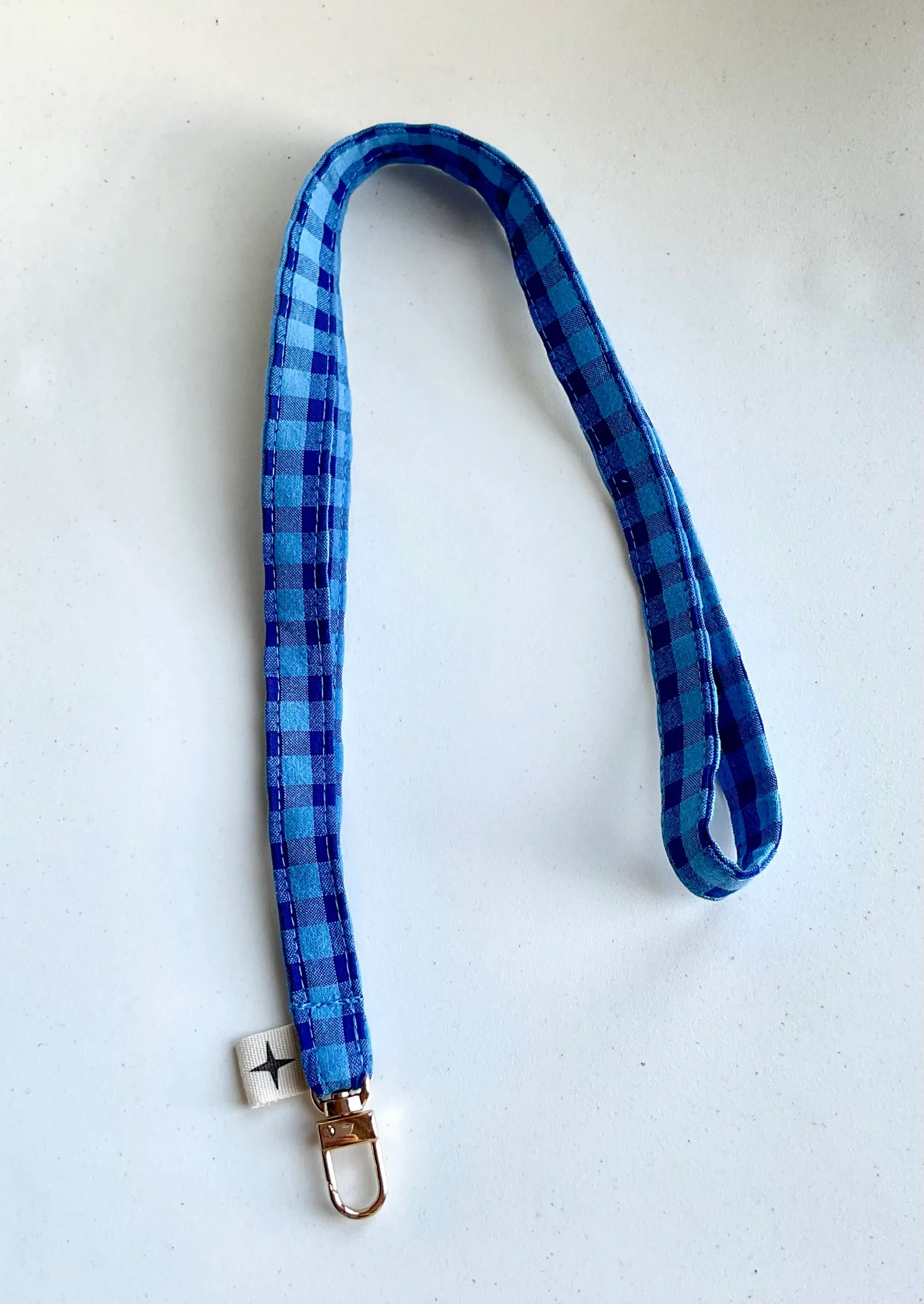 El lanyard Vichy azul está confeccionado en algodón 100% y mide 50 cm aproximadamente (contando el mosquetón, que además es muy discreto.)
